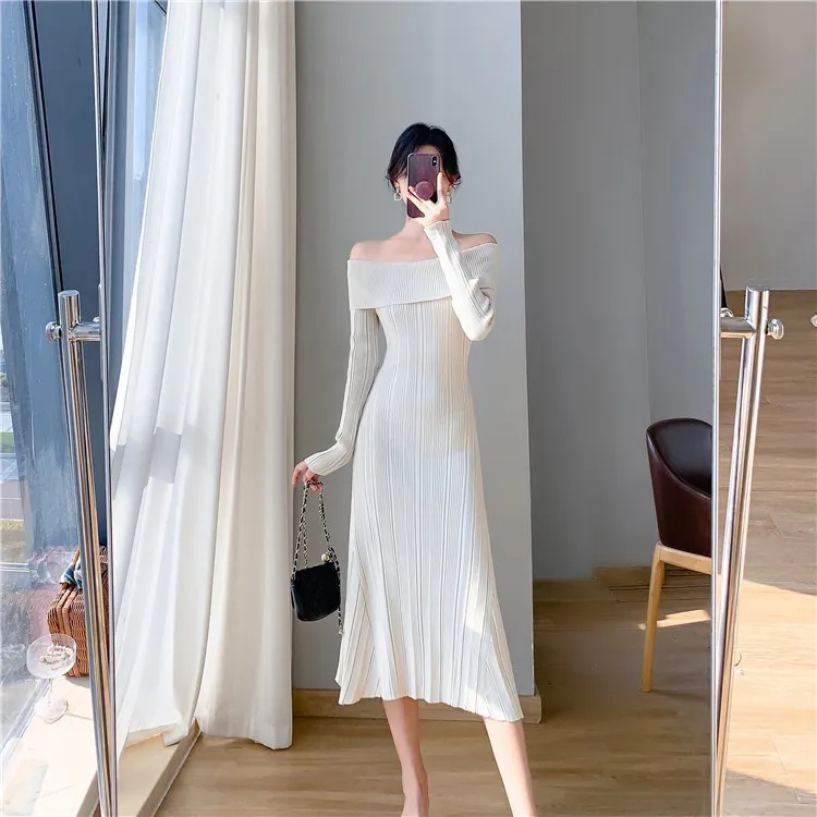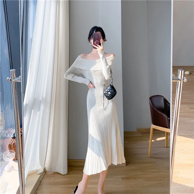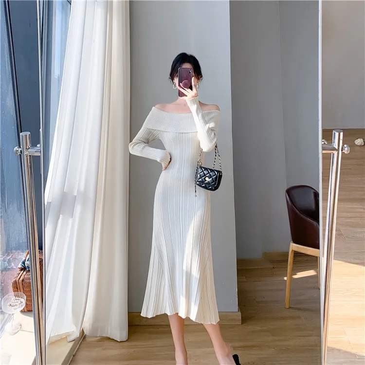 这款连衣裙采用一字肩设计,可以展现女性美丽的肩部线条和锁骨,修身的包臀款式可以突出女性身体的曲线,鱼尾裙为裙子增添了动感和优雅感。