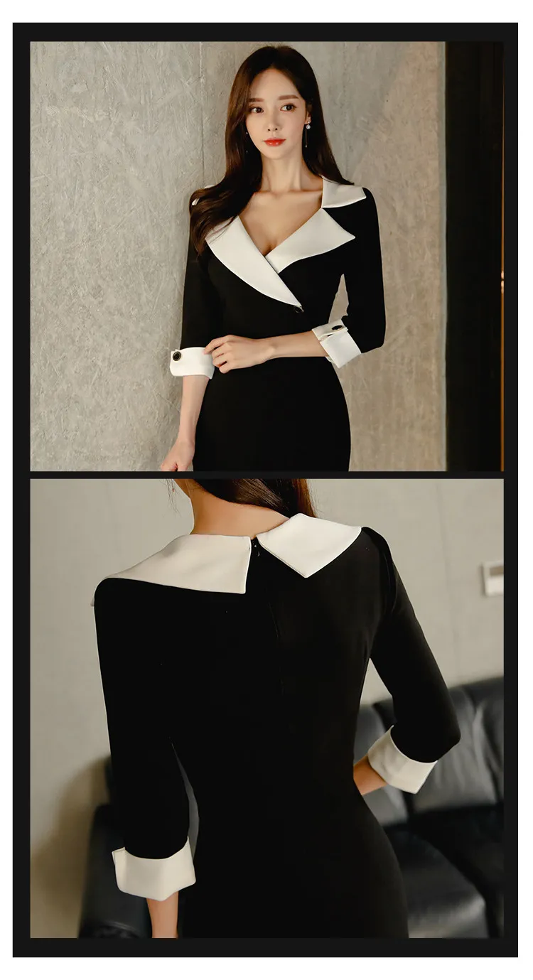 This is a dress with a unique design. It uses a suit collar design, which looks very neat. The color is black and white splicing, which is classic and fashionable. The seven-quarter sleeve design adds a bit of elegance and a certain practicality. At the same time, this dress also has a waist design, which can highlight the wearer‘s slender waist. The hip wrap style shows the curvature of women.